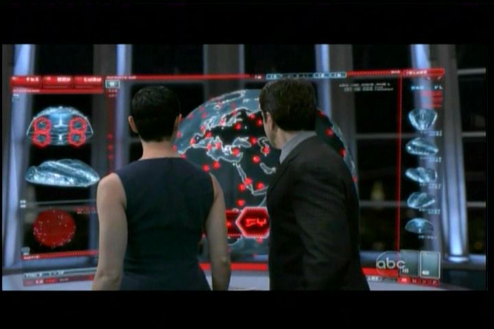 As Anna initiates her "retaliation" against Earth at 38:27 in the episode, the Visitor symbols at the bottom center of the holoscreen appear to spell GO. The dots on the globe appear to indicate a pattern into which the ships are to fall due to Anna's command; notice that some of the dots stay still and some move slightly to new positions. Some ships are even presented as being over unoccupied portions of ocean. mothership layout