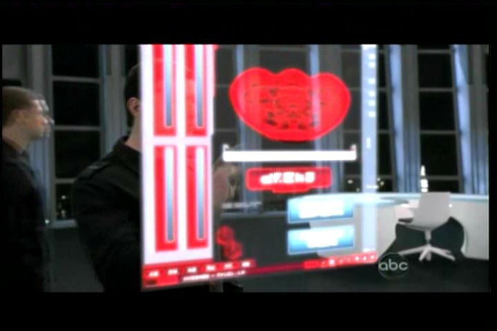 At 27:40 in the episode, a Visitor appears to be looking at a schematic of the mothership on a holoscreen, similar to the giant mothership schematic seen in the command center of the motherships on V80. The Visitorese word appearing below the schematic appears to be ALERT.