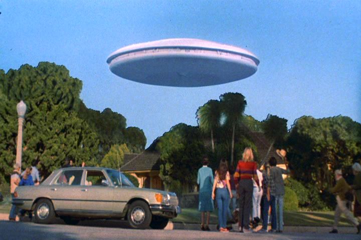 As the L.A. mothership moves into place over the city, we get a fairly bad cutaway image of a residential neighborhood with palm trees against the skyline. (The scene below, with a rear view of our characters, is also the only one left in the series featuring Dominique Dunne as Robin Maxwell, one of the few scenes that had been shot before she was killed by her ex-boyfriend in 1982.)